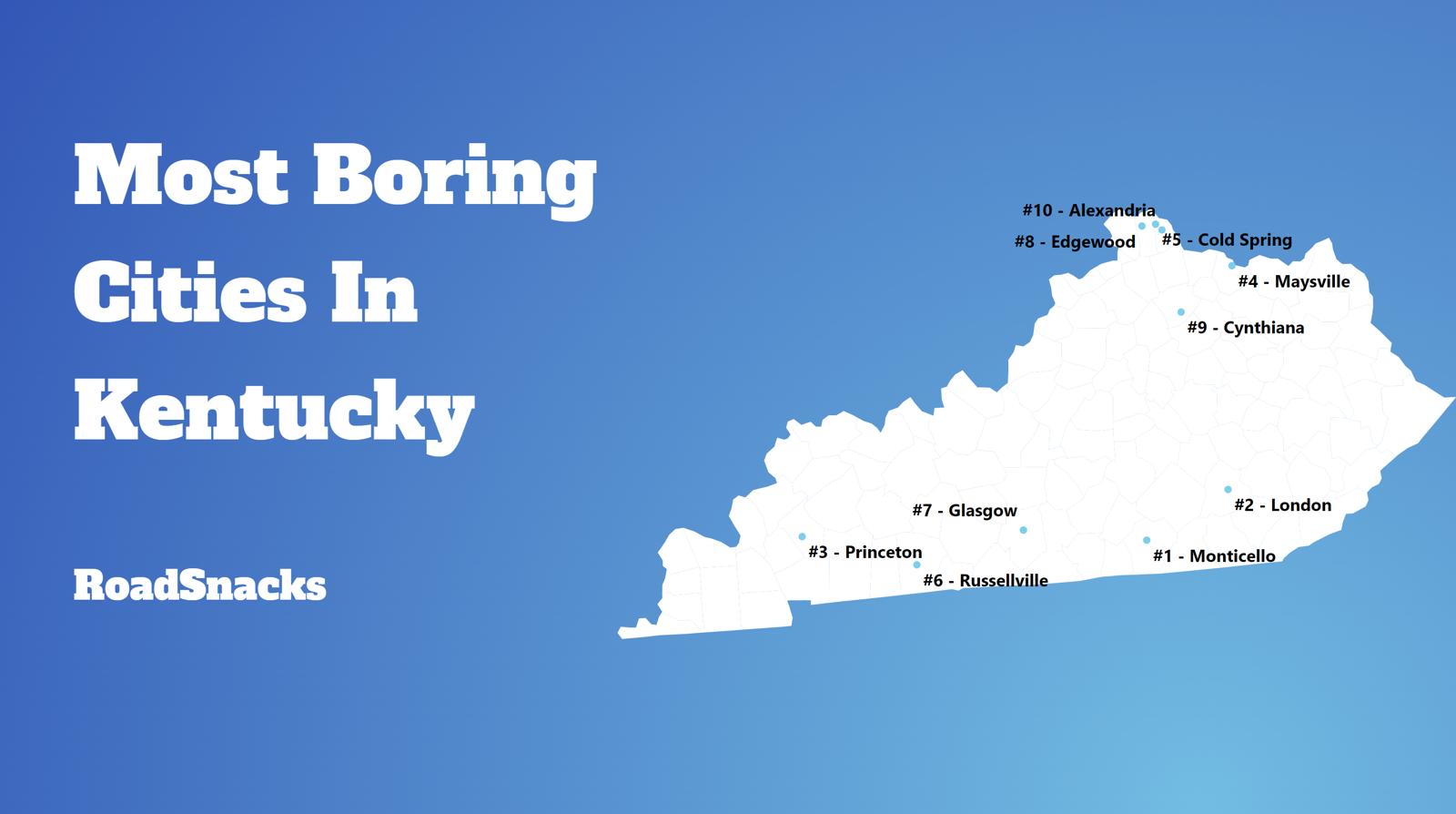 The most boring cities in Kentucky are Monticello, London, Russellville, Edgewood, Hazard, Princeton, Maysville, Alexandria, Glasgow, and Leitchfield.