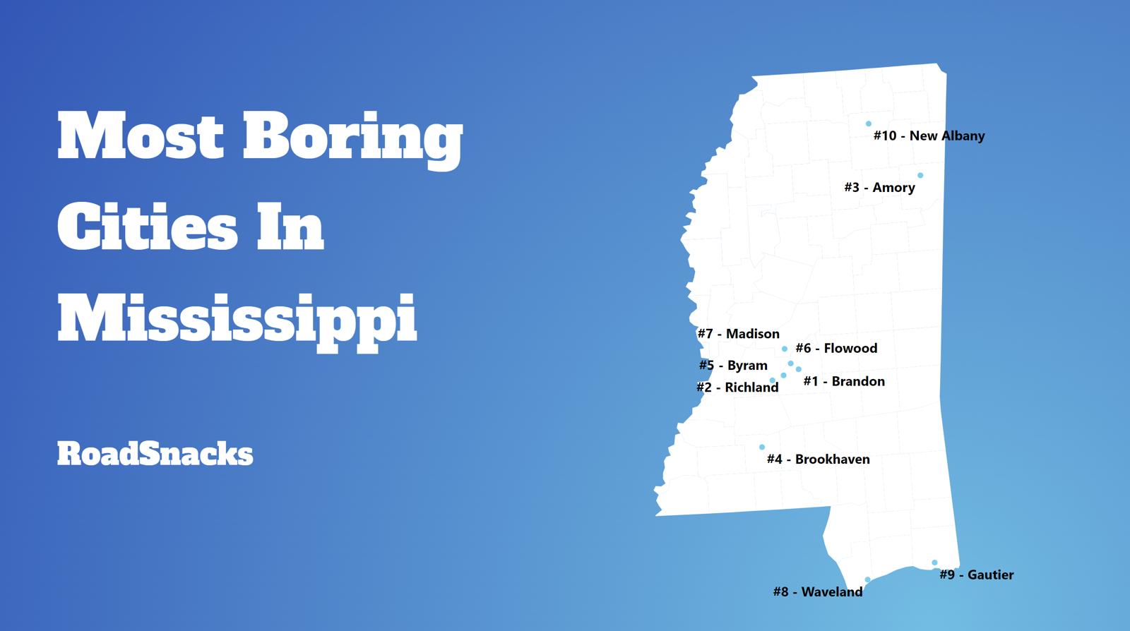 The most boring cities in Mississippi are Brandon, Amory, Leakesville, Louisville, Brookhaven, Byram, Madison, New Albany, Richland, and Moss Point.