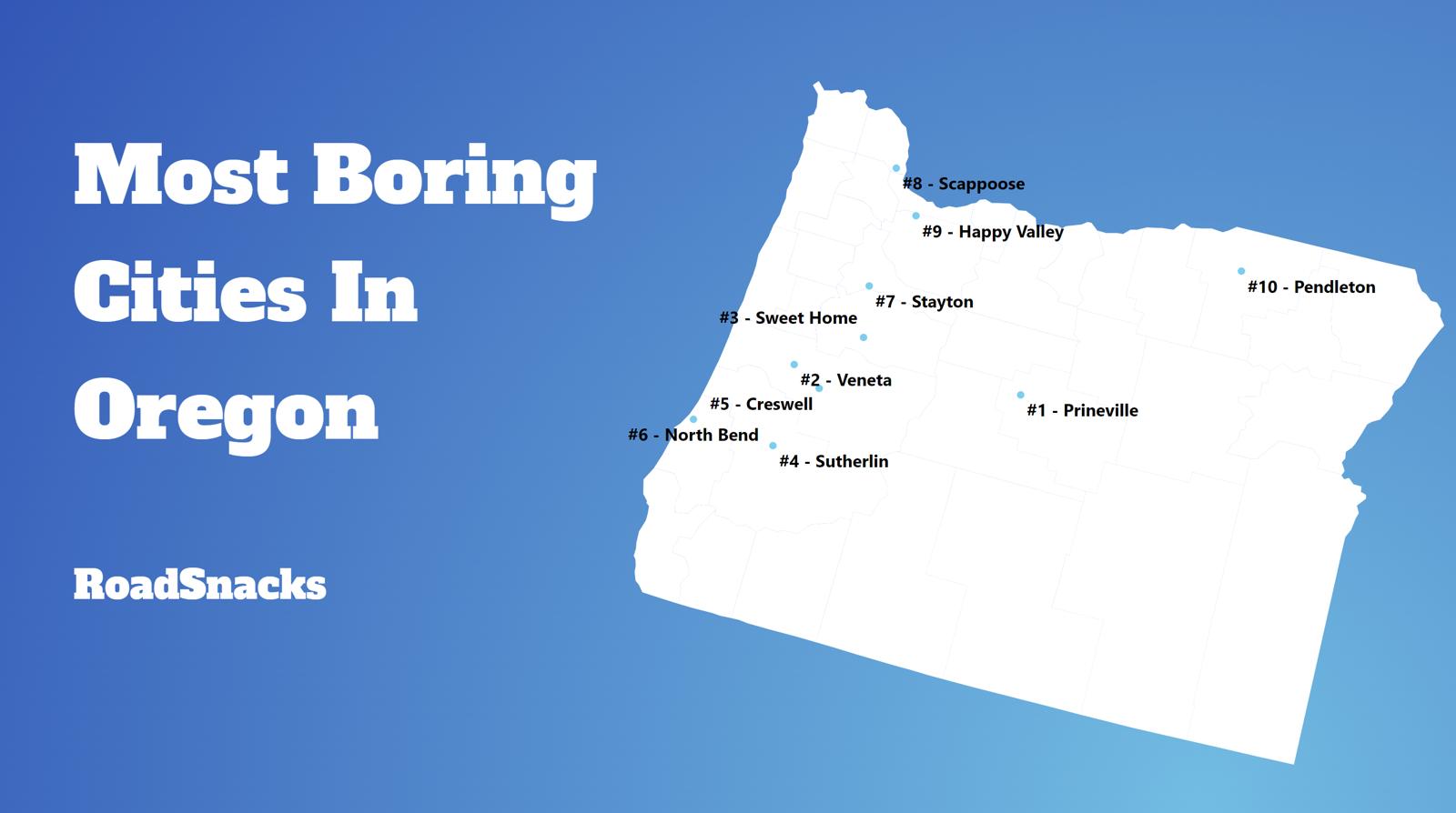 The most boring cities in Oregon are Prineville, Sweet Home, Creswell, Veneta, Stayton, Sutherlin, Brookings, North Bend, Sandy, and Winston.