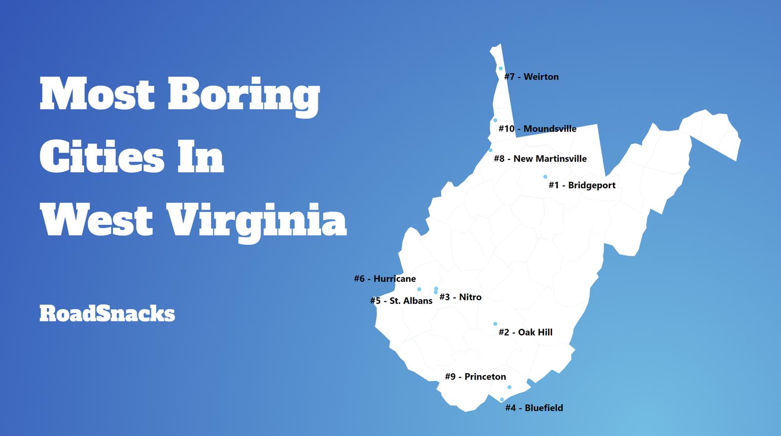 The most boring cities in West Virginia are Bridgeport, Oak Hill, Hurricane, Nitro, Moundsville, New Martinsville, Bluefield, Weirton, Princeton, and St. Albans.